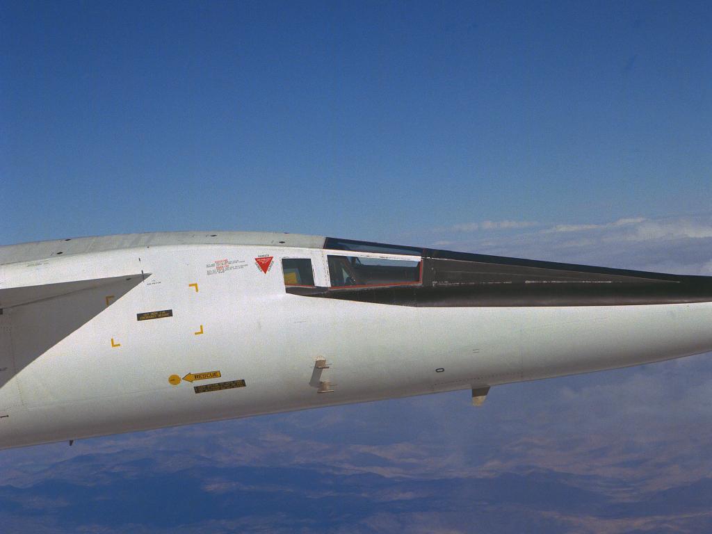 Detalhe do canopi do XB70, em posição de voo supersônico. Nessa posição a visão externa é prejudicada, mas o voo é feito somente por instrumentos.