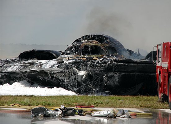 B2 acidentado em Guam, em 23/02/2008. O acidente foi causado por problemas na leitura dos dados do ar, fazendo o computador do bombardeiro errar nos cálculos. Os dois pilotos ejetaram em segurança.