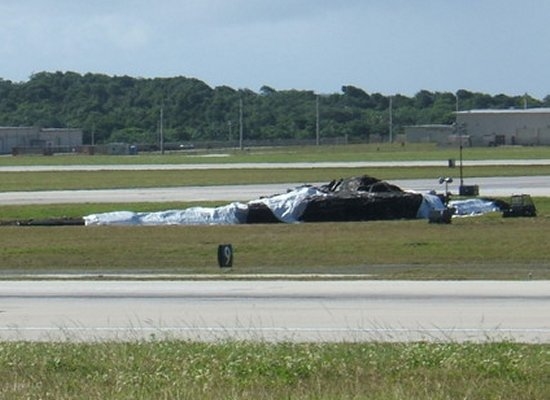 B2 acidentado em Guam, em 23/02/2008. O acidente foi causado por problemas na leitura dos dados do ar, fazendo o computador do bombardeiro errar nos cálculos. Os dois pilotos ejetaram em segurança.