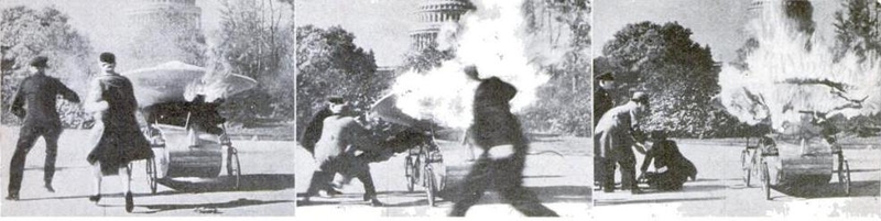 Dramática sequência de fotos mostrando o triphian de Viachos incendiando-se em uma demonstração pública.